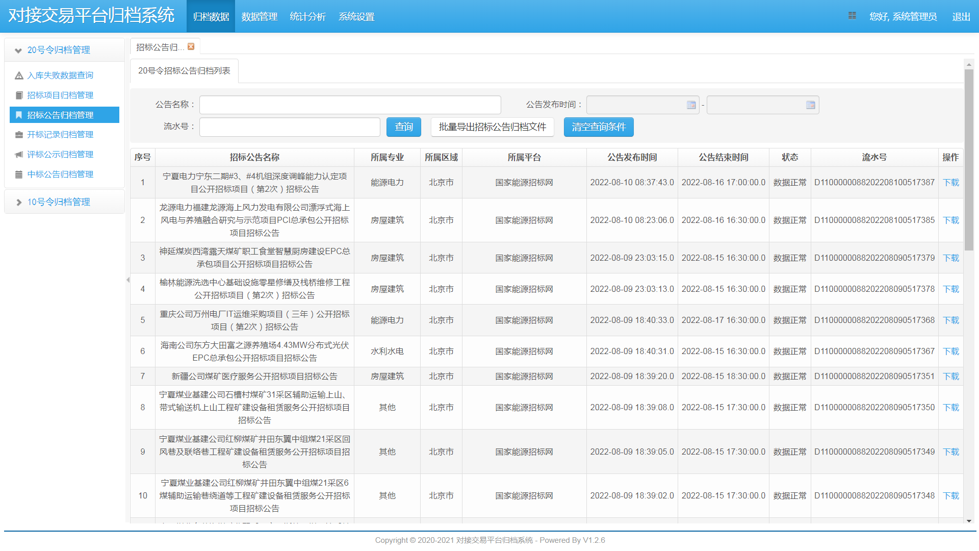 10號令歸檔備案系統(tǒng)包含:資格預(yù)審公告歸檔管理、招標(biāo)公告歸檔管理、中標(biāo)候選人公示歸檔管理、中標(biāo)公示歸檔管理、變更公告歸檔管理;