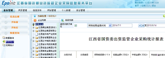 采購信息服務(wù)平臺自2014年12月1日上線以后,經(jīng)過幾輪大規(guī)模、全覆蓋式的超過1000人次的技術(shù)操作培訓(xùn)和系統(tǒng)的三輪完善,平臺運(yùn)行趨于穩(wěn)定。截止2015年6月14日上午11時(shí),已上線項(xiàng)目標(biāo)段數(shù)為1985項(xiàng),其中已做中標(biāo)結(jié)果備案的項(xiàng)目標(biāo)段數(shù)為1290項(xiàng),中標(biāo)和成交金額47.74億元,其中3月中標(biāo)和成交金額6.51億元,4月中標(biāo)和成交金額7.95億元,5月中標(biāo)和成交金額11.32億元,6月1日至14日中標(biāo)和成交金額16.48億元,成長性很強(qiáng)。具體的報(bào)表操作頁面可見圖三:采購信息服務(wù)平臺信息查詢頁面截圖,圖四:采購信息服務(wù)平臺標(biāo)段統(tǒng)計(jì)頁面截圖,圖五:采購信息服務(wù)平臺定期統(tǒng)計(jì)頁面截圖。