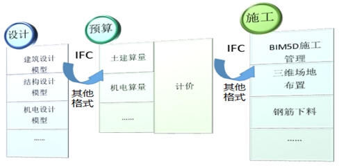 基于BIM技術的工程量計算軟件通過IFC數據格式,如圖4所示,實現與上、下游應用軟件的數據共享,不僅設計數據信息很好的傳遞下來,同時造價BIM模型還能往下傳遞到施工管理,打通全過程成本控制的通道;實現建設項目不同階段的數據共享。